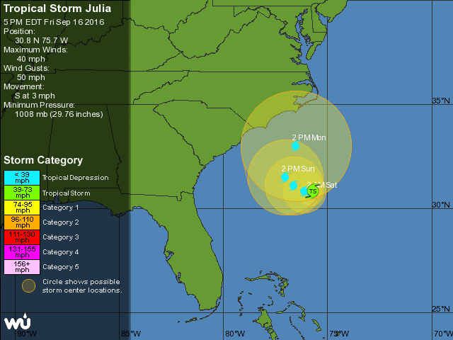 Tropical Storm Julia continues to meander off the SE US coast but towards late in the weekend we should see the storm moving away.  There are a couple models that want to bring the system back to the SW and over north Florida but I am not seeing that at this time.  Latest NHC forecast is here: