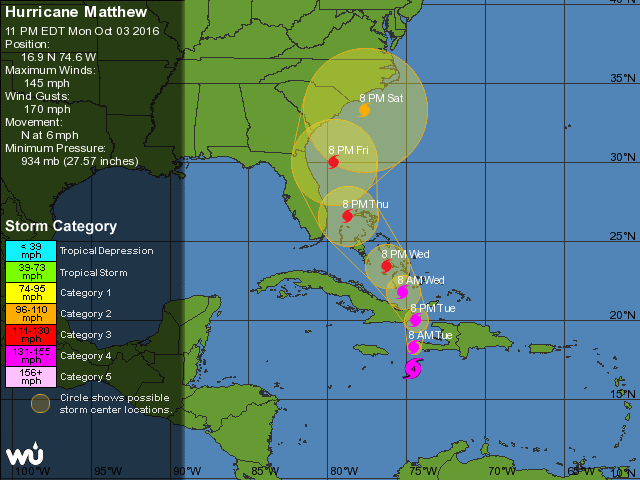 Hurricane Matthew Continues to Head Towards Florida – Watches/Warnings Expected Tuesday The NHC did not issue any watches or warnings for Florida tonight but we can expect them tomorrow with the 5am advisory. Get your sleep now… Here is the latest: Discover more from Pompano Weather Subscribe to get the latest posts sent to your email. Type your email… Subscribe Share this: Click to share on Facebook (Opens in new window) Facebook Click to share on Reddit (Opens in new window) Reddit Click to share on Telegram (Opens in new window) Telegram Click to share on Threads (Opens in new window) Threads Click to share on WhatsApp (Opens in new window) WhatsApp Click to share on Mastodon (Opens in new window) Mastodon Click to share on Bluesky (Opens in new window) Bluesky Like Loading... Author: Howard Love talking about the weather, technology, and family (and not in that order). View all posts by Howard