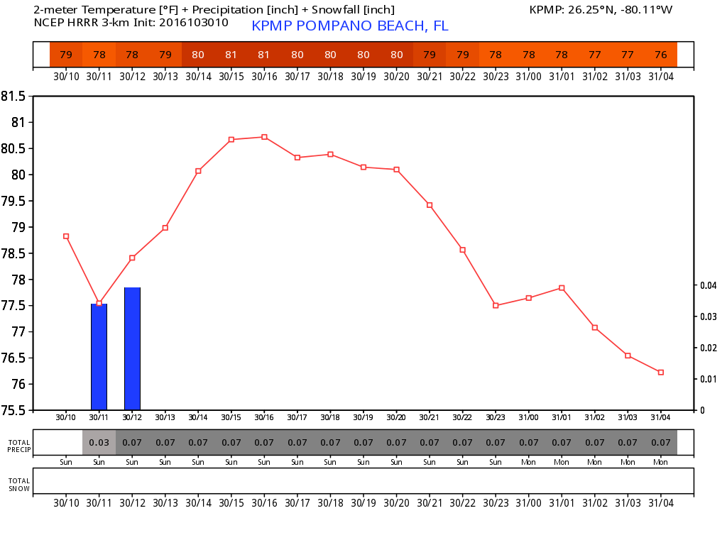 We have one more day of breezy, light showers as drier air works into the area this afternoon. High today will be 81F as clouds will again help keep our temps suppressed. The latest HRRR shows this: