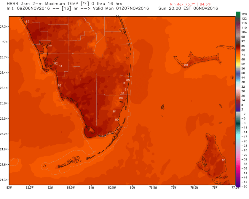 Start no our day at 75F and the sun already up before 7am. After a few showers yesterday we will have breezy, partly cloudy conditions today with a pleasant high of 81F. Still cannot rule out a stray shower but not likely at all. Here are today’s highs across the area according to the latest HRRR.