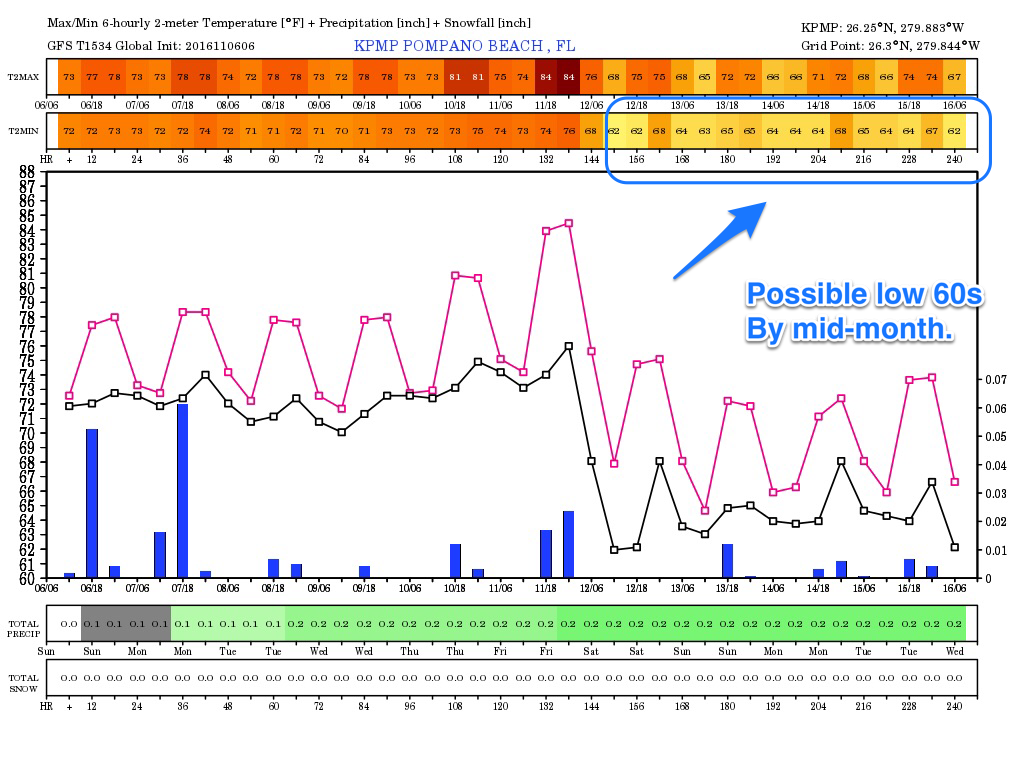 As mentioned yesterday, and the trend is continueing, we may see some cooler temps as we get into the 13th to the 16th of the month. The GFS continues to show this and for those who like a little nip in the air you will not be disappointed.