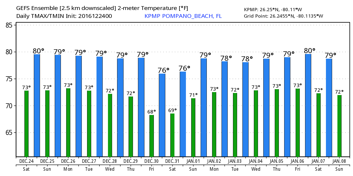 No real changes going into Christmas Day and our temps will continue warm through the coming week.  Next weekend we could possibly have cooler weather but there is not real consensus on that yet.  Here is the latest GEFS highs and lows for the next 16 days: