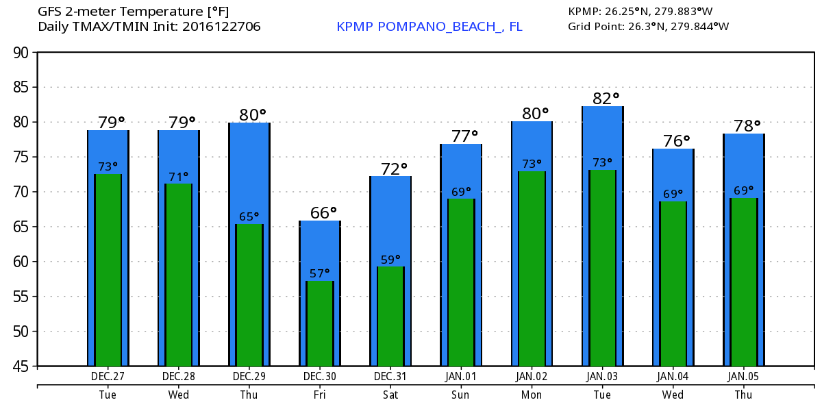 As mentioned yesterday, Friday we will get a shot of cooler weather that will not last long but will remind us it is winter. At this time I would not expect out high on Friday to break 70F. Here is the latest 10 day highs and lows per the GFS.