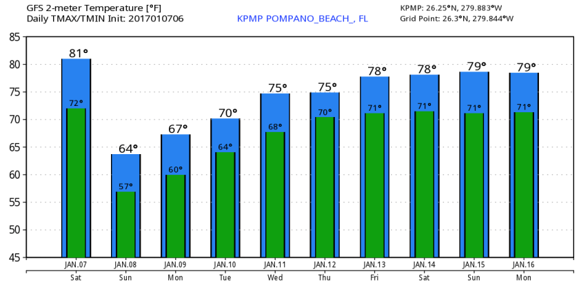 Sunday will be nice with breezy conditions and not as warm with a high of 66F. Here is the latest GFS highs and lows through next weekend: