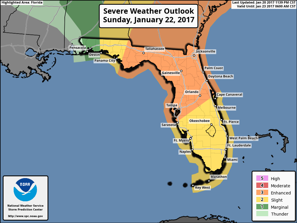 Tomorrow evening into the overnight hours we will see a squall line associated with a cold front sweep through the area.  Thee is potential for gusty winds, small hail, lightning, and a possible tornado.  I will have let on this later today.  Currently the SPC has the entire south Florida area in a “slight” chance of severe weather.
