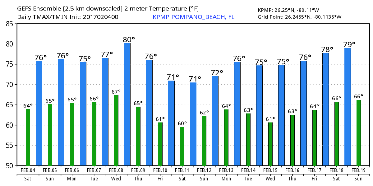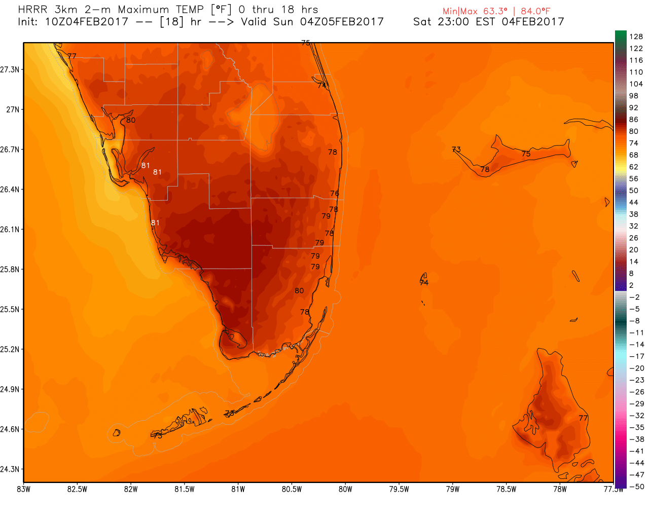 After a rainy, cold Sunday last weekend we are off to a great start today. 63F this morning in Pompano on our way to a high of 77F with a few clouds and no rain expected. Highs in the area per the latest HRRR: