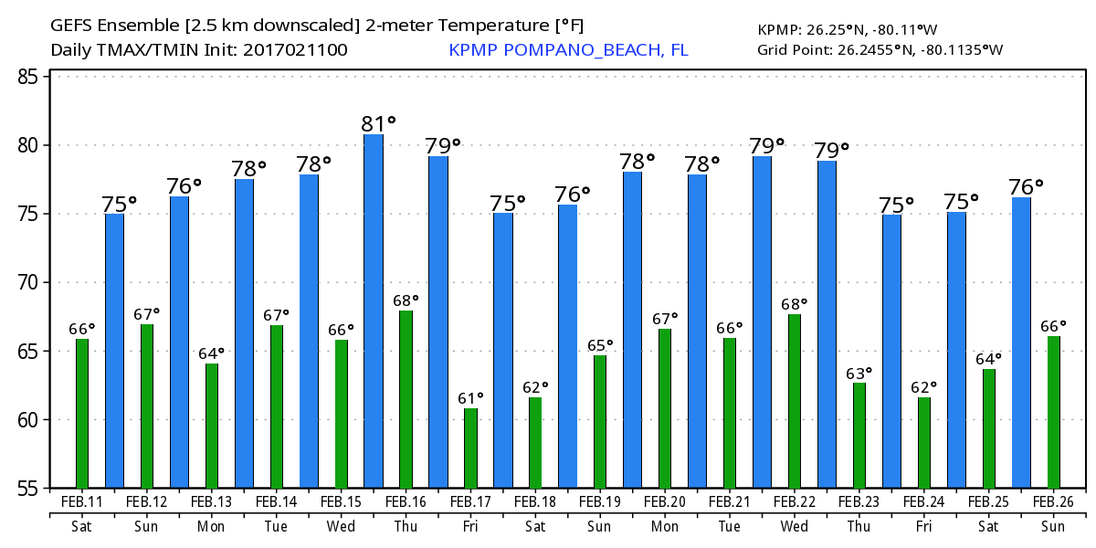 Looking ahead, not seeing any extreme changes and rain will be minimal for the next five to seven days. Here is the latest GEFS highs and lows for Pompano: