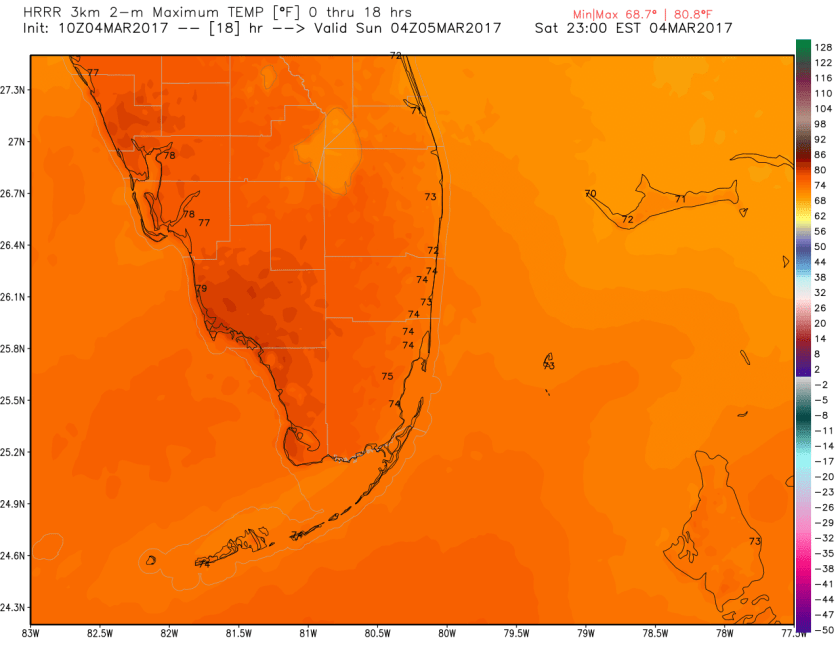 Today we will see some clouds and the ever so slightest chance of a light, quick shower with a high of 75F. Latest HRRR highs for today