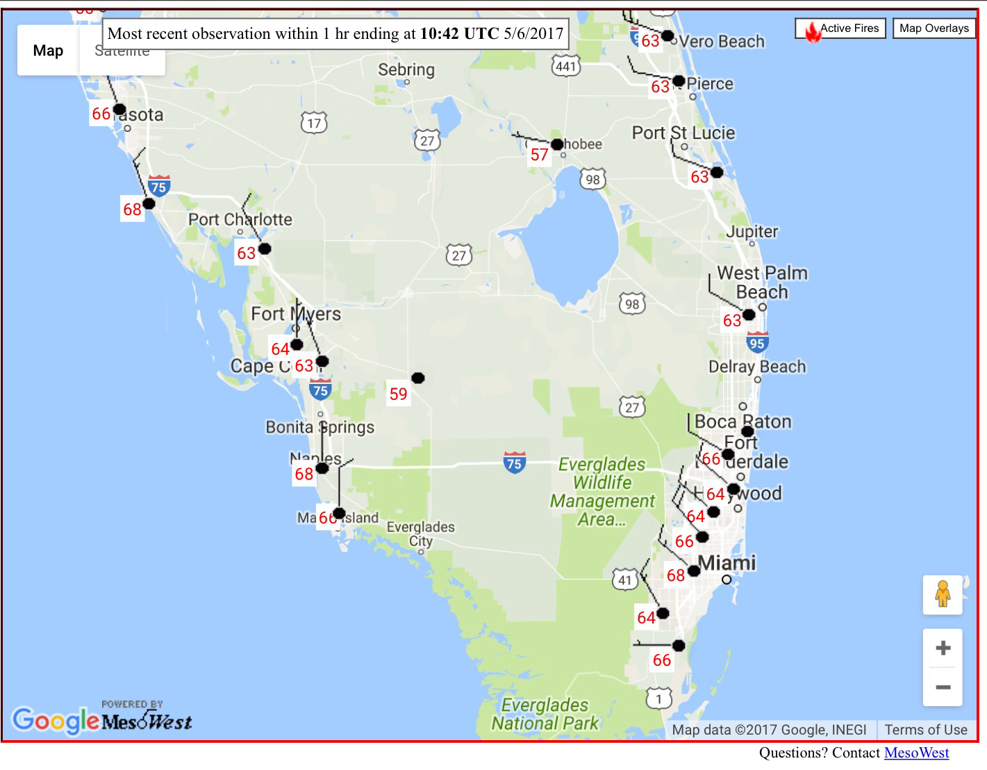 With so many outdoor activities this weekend weather will not be an issue to enjoy them. Starting off this Saturday at 68F which is slightly below average for this time of the year. We had a cold front sweep through late yesterday dropping our dew points and clearing our skies, setting up for a beautiful weeeknd weatherwise. Latest temps across south Florida this morning: