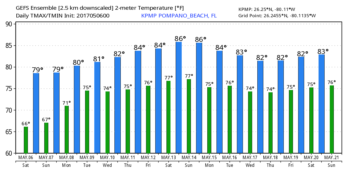 The next five days appear to be mostly dry with no extreme swings in the weather. Only thing of note is tomorrow morning will be a few degrees cooler than today. Latest GEFS highs/lows:
