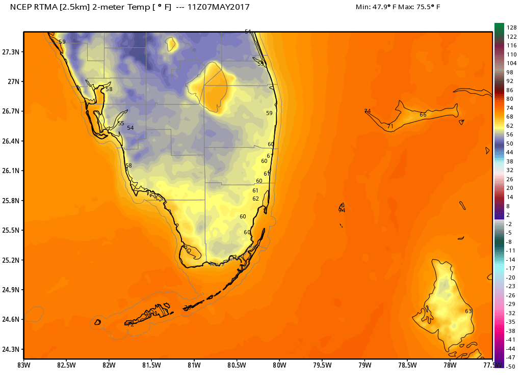 There is not much to say about today’s weather besides it is ideal, like yesterday, for any and all outdoor spectator events like the Ft. Lauderdale Air Show, SunFest, or your own reasons. A “cool” 66F in Pompano at 8am and looking at a high of 82F. Area temps this morning: