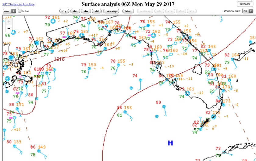With high pressure to our southwest we should see the sea breeze push in earlier in the day keeping us at a high of 90F. This morning’s surface analysis looks like this as of 2am: