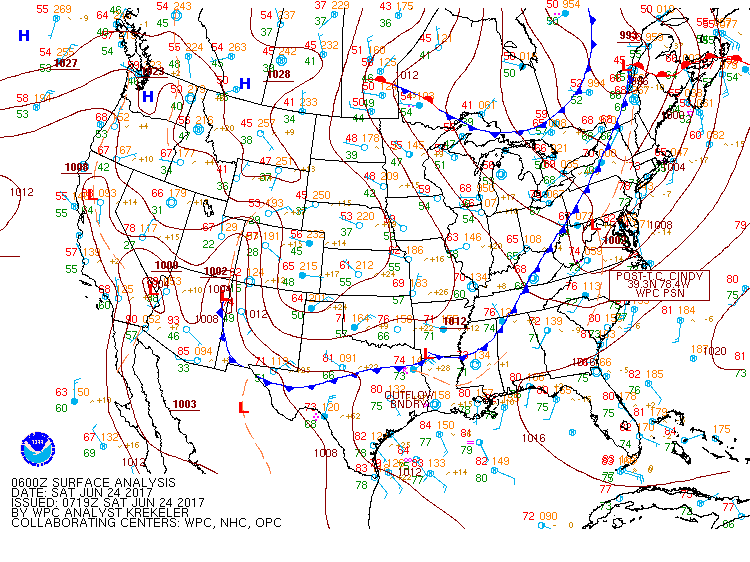 Surface analysis this morning shows we are under the influence of high pressure to our east. Also seen here are the remnants of Cindy now over Pennsylvania/DelMarVa area.