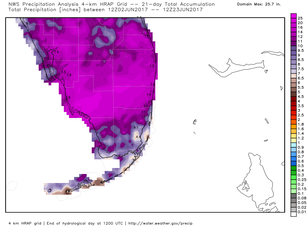 In comparison to our drier weather this weekend we can see over the past 21 days coastal Broward has accumulated 11-15 inches of rain, much more than “normal” for this time of year.