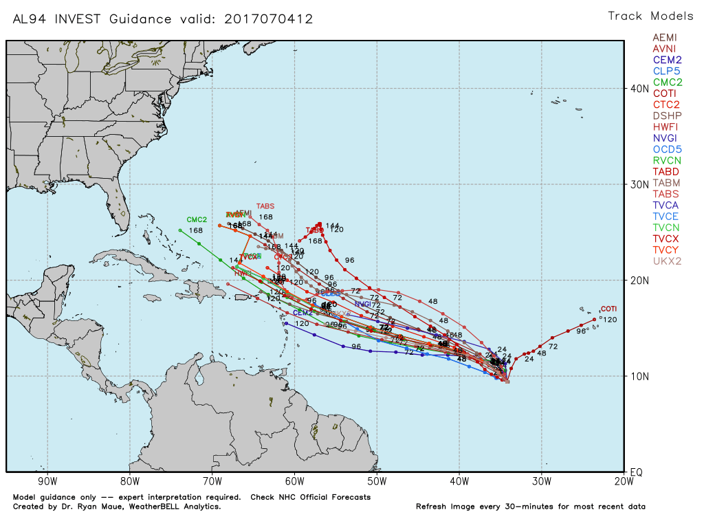 I am also watching an area of disturbed weather in the Atlantic which the NHC indicates a high risk of formation over the next five days. Nothing for us to be worried about at this time but will continue to watch. Latest model runs look like this: