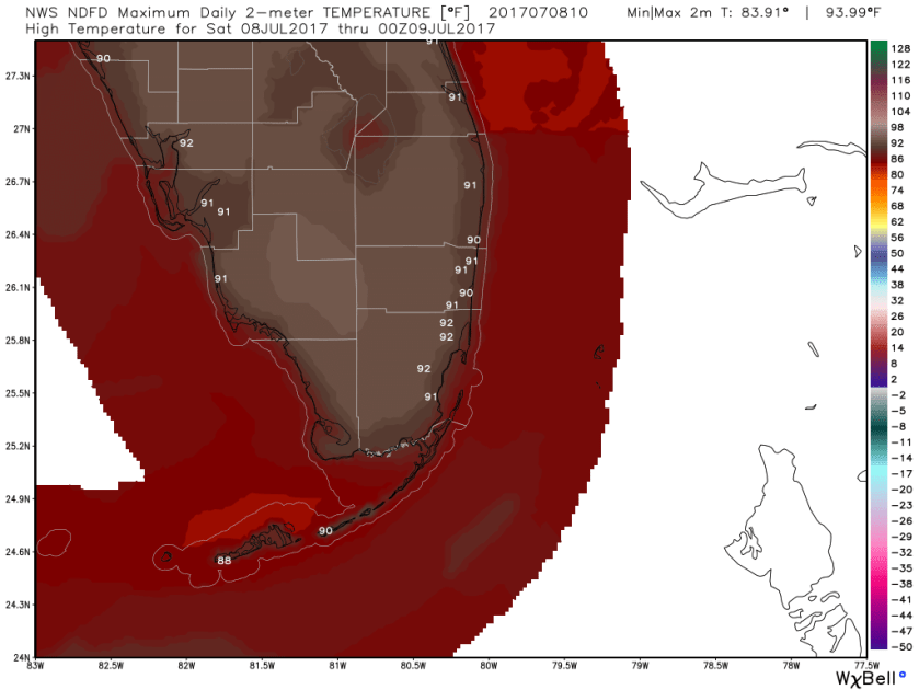 Not departing from the pattern of the past week, we will see a slight chance of a shower but otherwise highs will be near normal, 90F, and lows above average 83F. If we see a decent shower or thunderstorm our low will like be sub-80F. Below you will see today’s forecasted highs from the NWS.