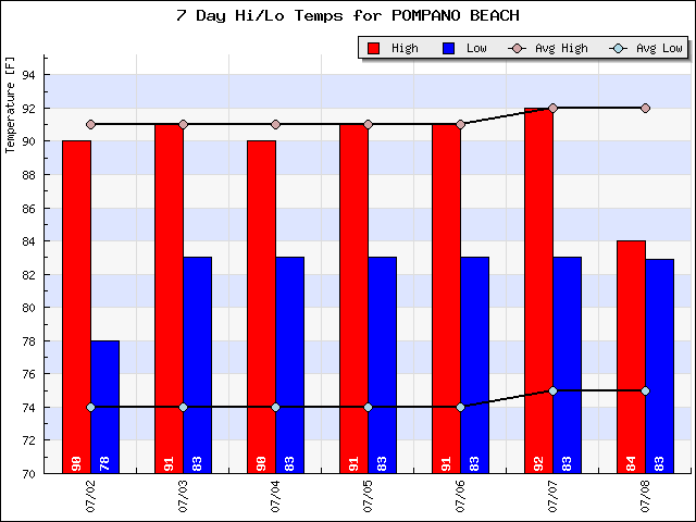 I did have a couple people ask this past week if we have been hotter than usual. Our highs have not been but out lows are above average as mentioned above. In fact, this past week Pompano has not been under 80F. This can be seen in the graph below showing our highs around 90F and lows above 80F, just like the forecast.