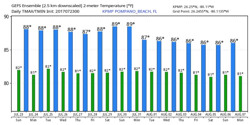 The week ahead we do not see much change with a slight increase in shower activity after Tuesday. Temps will be mostly in the low 80s in the morning and around 90F for our highs. Latest GEFS shows this as well.