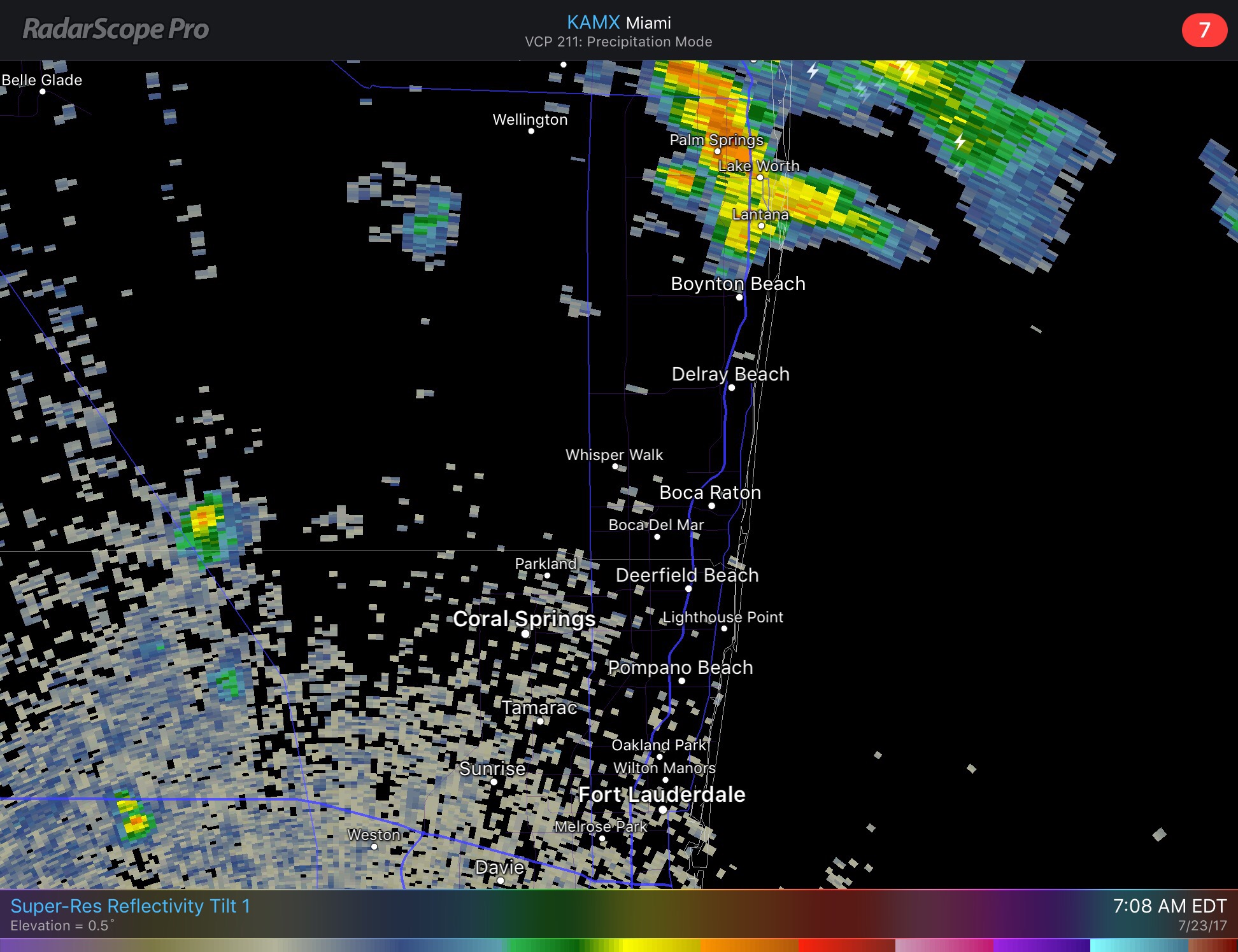 A breezy 83F to startbour Sunday off in Pompano Beach with the few scattered showers from the pre-dawn hours dissipated. There is a clusters of thunderstorms affecting the West Palm Beach area but besides that not much else along the coast at this time.