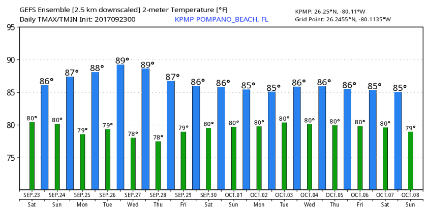 High today will be 90F. Tomorrow will be about the same with less shower activity from what I am seeing at this time. Looking into next week our highs and lows will,not change much with the latest GEFS run.