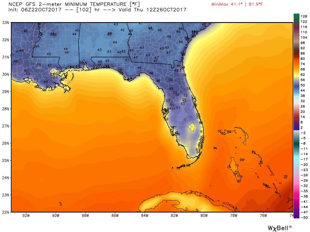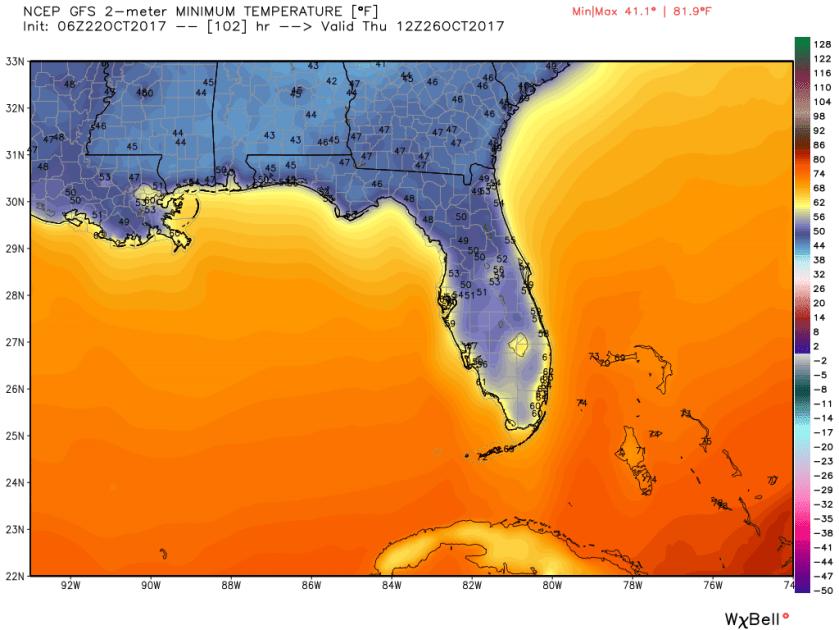 Looking to the weeks ahead we still see the front approaching the area on Tuesday with a line of showers and a few thunderstorms ahead of it then some Florida fall air will be upon us. It will not last long but will give us a refreshing burst mid week. Lows across the state according to the latest GFS for Thursday morning: