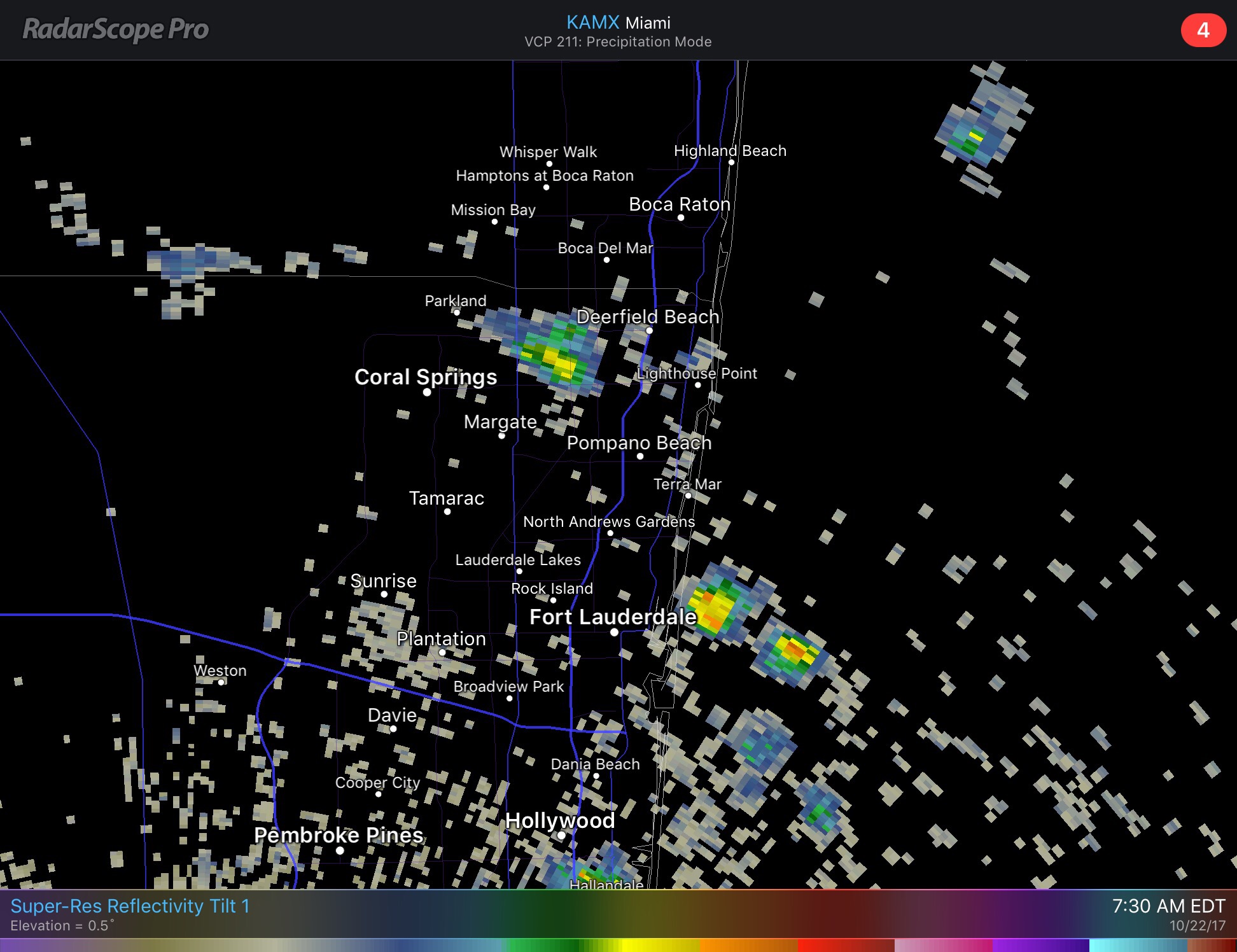 A very warm 82F to start this Sunday off in Pompano with clouds, a strong easterly breeze, a a few showers. Latest radar looks like this.