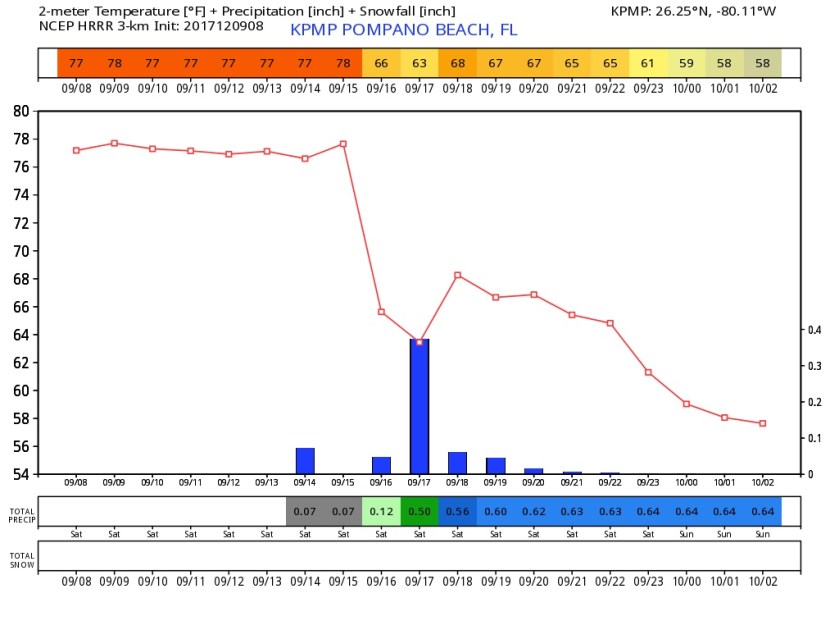 The front comes through the area today with rain and a few thunderstorms possible. Rainfall amounts are expected to be about a about a half-inch. Currently a Severe Thunderstorm Warning is in effect for the Naples area. The latest HRRR shows the peak rain around noon today with clearing by mid-afternoon. Temps drop quickly with the arrival of rain.