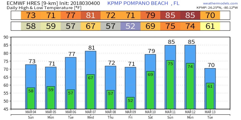 In Pompano we are at 58F this morning as we enjoy our second “cooler” morning. Though our temps are only slightly below normal with the warmer February we had I think all of our enjoying this change.