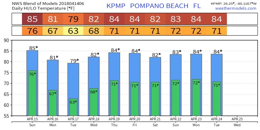 Winds are starting to veer from the southeast late this morning which will limit rainfall potential to near zero along the coast and a few showers inland. High today will be 87F.