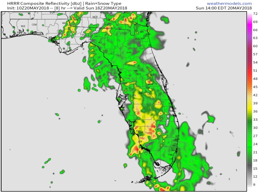 Local high resolution models maintain the rain activity throughout the day, here is the HRRR simulate radar for 3pm today.