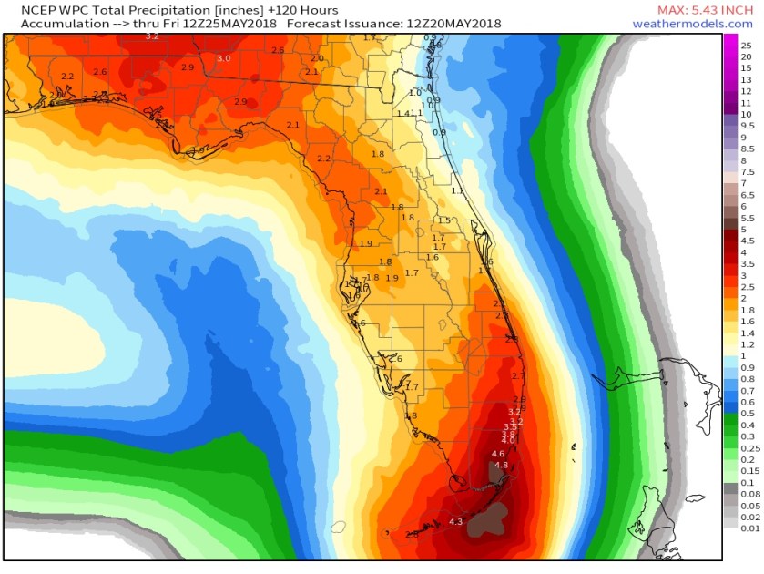 As mentioned rain is on tap for the work week ahead too. Official NWS rainfall forecast for the entire state show moat all areas receiving at least an inch over the next five days with southeast Florida seeing much more.