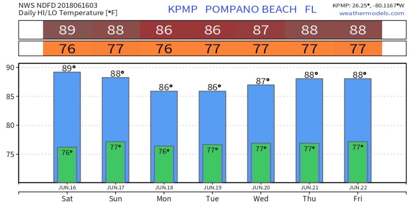 Today’s high will be 89F with our weather threats being lightning associated with the any of the storms that form and a waterspout cannot be ruled out for coastal shower activity.