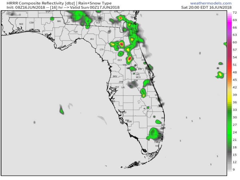 Good morning and it appears we are on the brink of some slightly drier weather ahead for the weekend and into early next week. High pressure over the Bahamas will move west. This will not eliminate showers/thunderstorms but the coverage will be less and focus more towards the center of the state. The latest HRRR shows showers not as widespread late afternoon today.