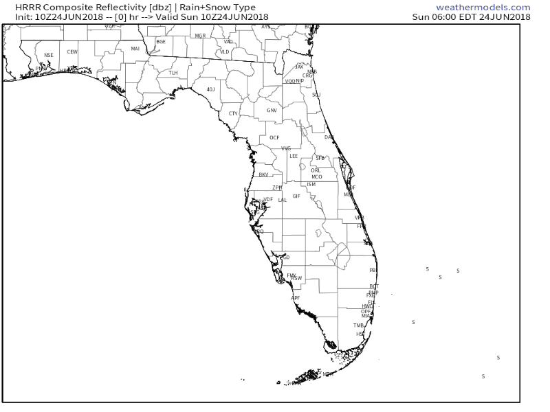 Like previous days we will see our high at 91F with showers and thunderstorms developing early to mid afternoon. The change today is they will not be as plentiful along the east coast and the activity will move off to the west. Latest HRRR shows this very well.