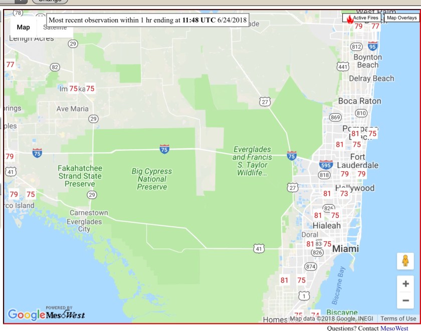 We are certainly in our summertime pattern. Temp in the 7am hour is 81F with a dewpoint of 75F with nearly no wind.