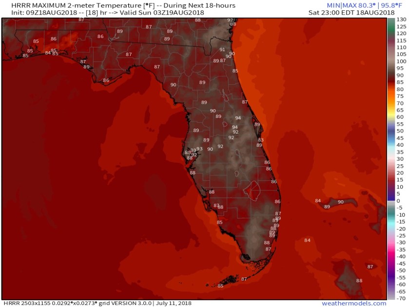 Good Morning as we start off with a couple very light, quick showers in the area. Models are hinting at our high today of sub-90F and I will agree that 89F May. It be refreshing but not the 91-92F we have seen recently. Latest highs from the HRRR for Florida.