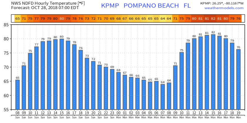 Today will be a “Chamber of Commerce” day with a few clouds and a high of 80F. Hourly temps through the next 30 hours will look like this.