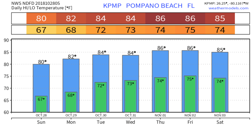So after another night in the 60s we will return to our lows in the 70s for the next week or so. No significant weather is expected this week including what should be a pleasant Halloween evening with barely a chance of rain and moderate temps. Next chance of rain will be on Thursday and going into the weekend. NWS forecasted highs and lows are not bad at all.