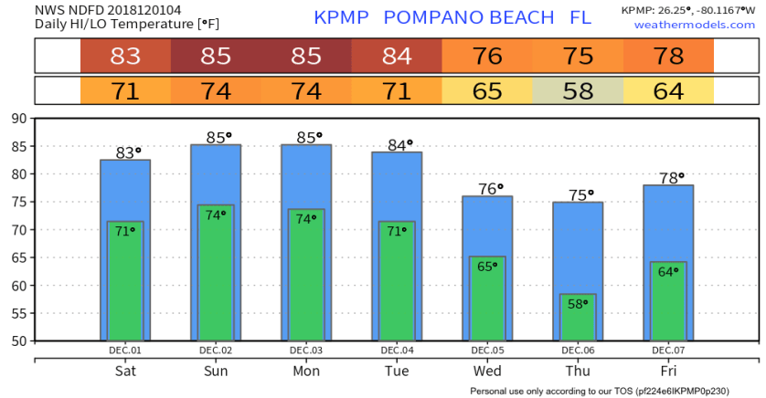 Currently we are about 10 degrees warmer than our high of 65F on Wednesday along with some clouds and breezy conditions in Pompano.