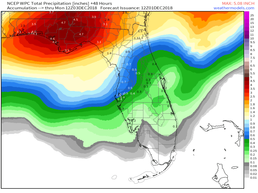As mentioned rainfall will be very minimal in south Florida with heavier amounts going into the central and northern parts of the state. Forecasted rainfall totals through 8am Monday are: