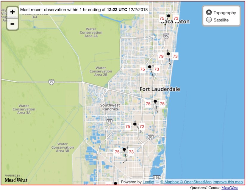 It is December but the thermometer does not agree this morning. At 7am we are at 79F with a dewpoint of 73F. When you walk outside you will feel the mugginess. All areas of southeast Florida are in the 70s.