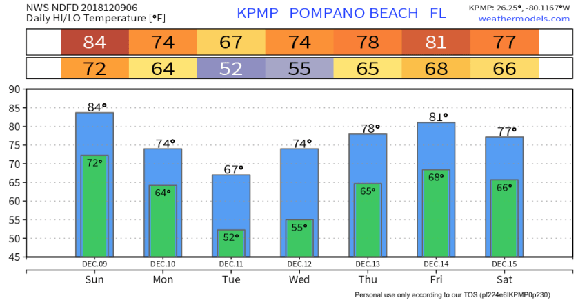 Will be cooler tonight but our coldest morning will be Tuesday and Wednesday so have the jacket ready. NWS highs and lows for the next week: