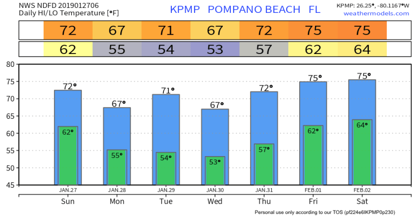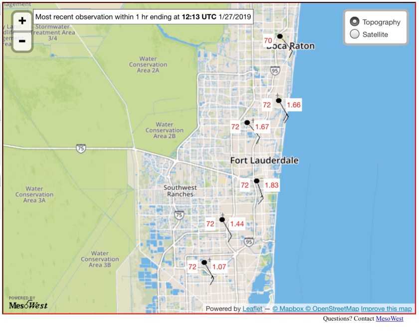 A bit warmer this morning compared to yesterday with a temp of 72°. In the past 24 hours Pompano Beach had 1.62 inches of rain. Other current temps and 24 hour rainfall are below.