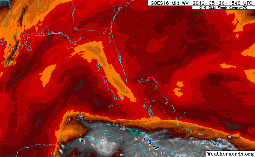 A very uncharacteristically dry atmosphere is still over us thanks to high pressure will greatly minimize the chance of rain again today. Generally with an easterly wind we see occasional showers but that is not the case today. Compared to yesterday we are seeing some moist air starting to move north from the Caribbean to over Cuba today. Satellite images show the dry air over us (oranges and reds) with the brighter colors over and south of Cuba.