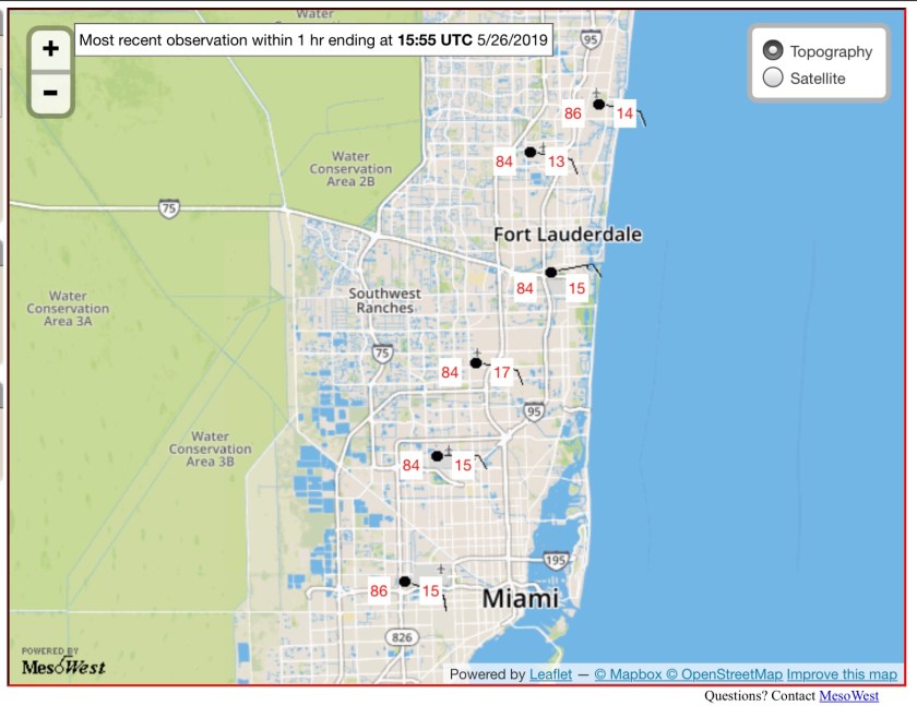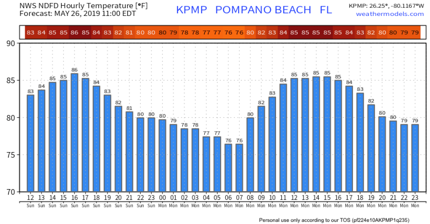 As we approach the noon hour we are at 86° in Pompano with an easterly wind of 14mph. We have a couple more degrees to go towards our high today of 89°.