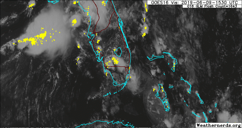 Widespread showers and thunderstorms are expected again this Sunday afternoon. Satellite shows some of the activity already with the lighting mapper indicating activity now over the east coast areas and southwest of the lake.