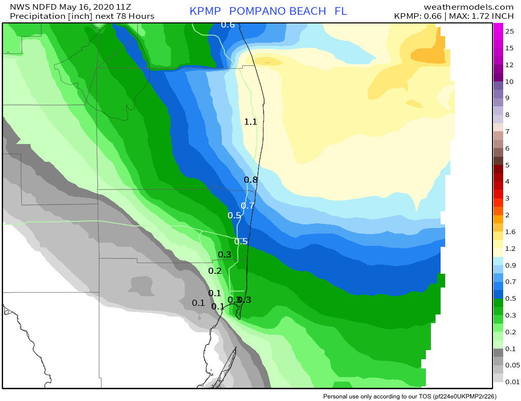 Current three day rainfall forecast is about a half-inch to 1.5 inches. Over SE Florida.