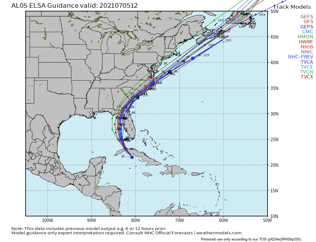 Tropical Storm Elsa is about 20 miles from the coast of Cuba with maximum winds of 65mph. Elsa is moving NW at 14mph.