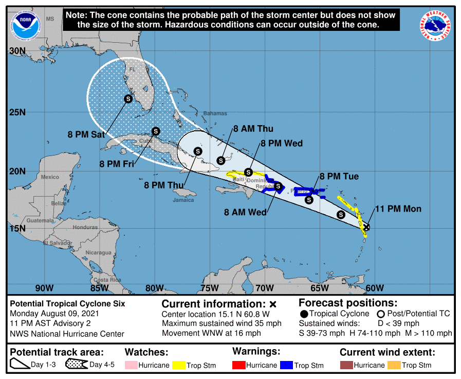 Quick update, watching PTC 6 that was designated earlier this evening. As of 11pm south Florida remains in the forecast cone as the system continues to develop. Currently, most model guidance is in line with the official forecasts keeping what is likely to become Tropical Storm Fred below hurricane strength through five days. Impacts from the storm are likely to affect the area between Friday and Sunday with the primary threat being heavy rain and gusty winds. It is too early to determine the exact extent but as of now the worst case would be five or six inches of rain and wind gusts up to 45 mph.