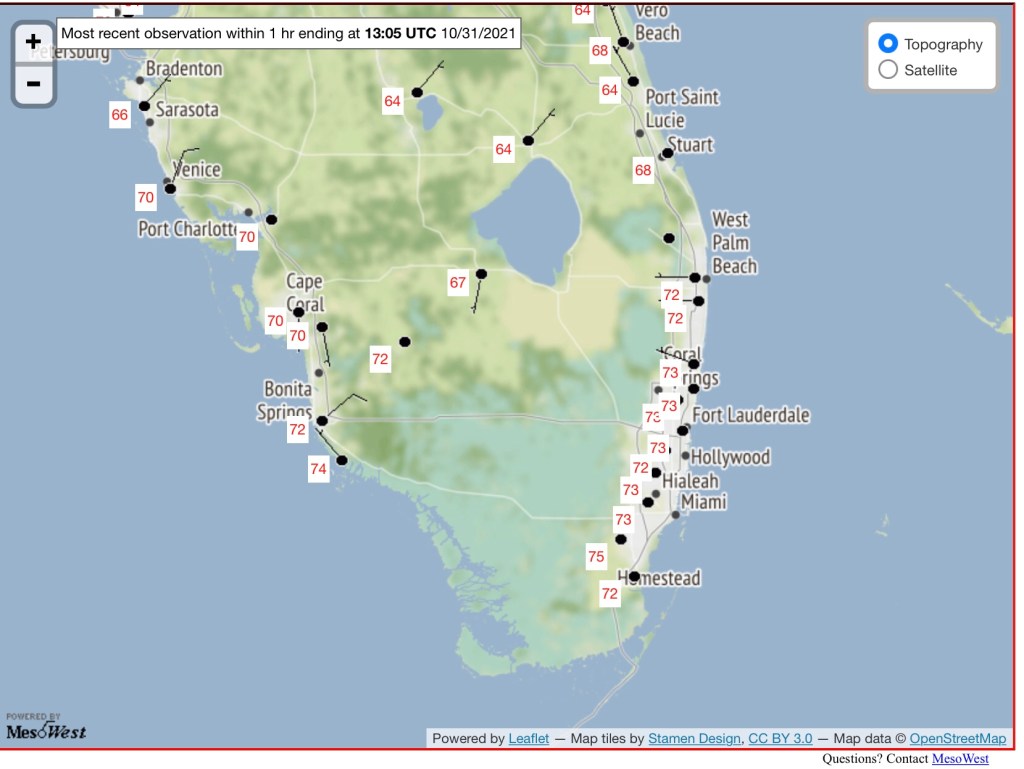 After a low of 66° this morning around 4am we have wormed up to 73° on our way up to 84° today. All of Florida is enjoying the Florida-Fall weather.